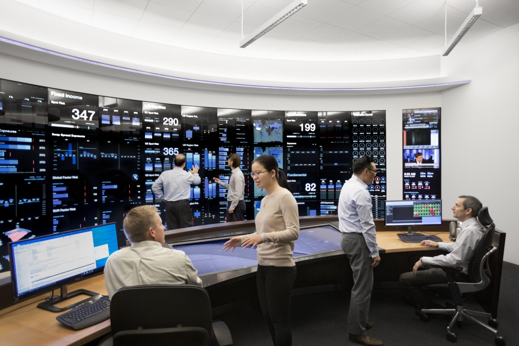 Risk Management Center provides a comprehensive view of the various investment portfolios and how they fit within pre-established guidelines. Built in 2014, its front-end consists of a 27’ by 8’ interactive touchscreen designed to visualize data in ways that allow for rapid comprehension. Its back-end systems, which connect to every office worldwide, continuously run a wide range of operational readiness, risk, and stress test monitors.
